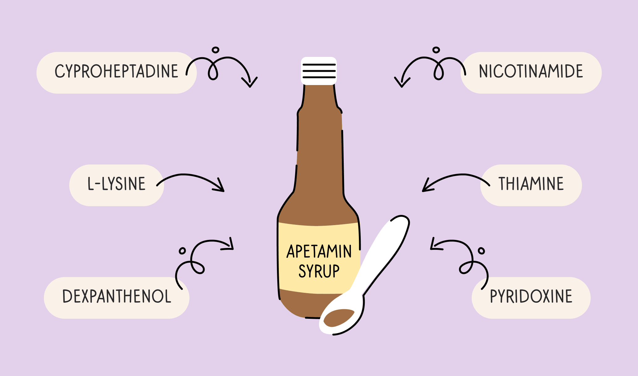 One teaspoon or 5ml of Apetamin syrup contains the following ingredients:1Garland V, Kumar A, Theisen B, Borum ML. June 23, 2020. Apetamin Hepatotoxicity: Potential Consequences of Purchasing a Body Enhancement Drug Off the Internet. ACG Case Rep J. DOI:10.14309/crj.0000000000000398